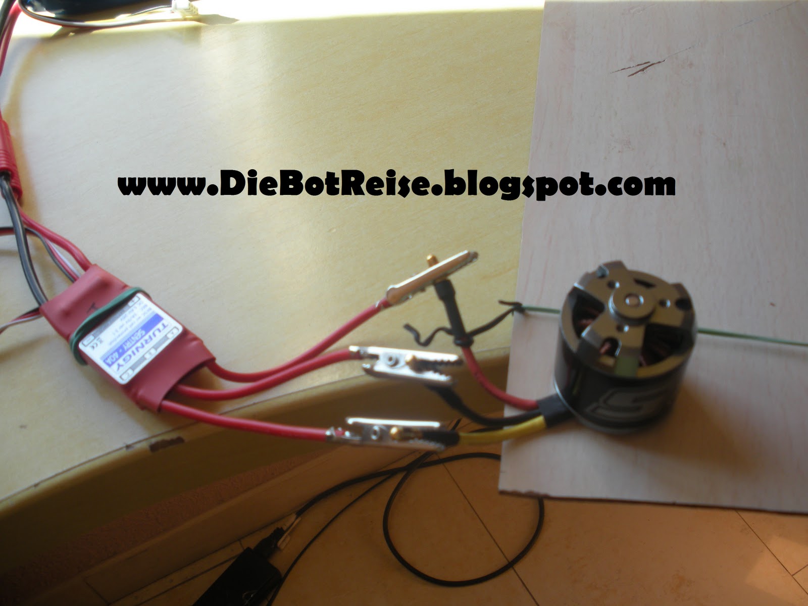 To connect the ESC, we connect the power cables to the LiPo battery by means of a 4mm banana connector (we can also use an external power supply, but we must make sure that it has the power that the engine requires… which is usually high when starting). And for the engine connections, in my case I have soldered some clamps as shown in the figure. Important to tie the engine to a fixed place, because when it starts, it can be dangerous and more if it is an outrunner engine.